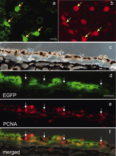 Complete retinal regeneration occurs after the removal of the whole tissue in mature Xenopus laevis, as well as in the newt. Here, we produced F1 and F2 lines of transgenic X. laevis containing an EGFP gene under a translation elongation factor 1-α (ef1-α) promoter and investigated how the gene is reactivated in retinal pigmented epithelial (RPE) cells when the neural retina (NR) is removed. The results showed that EGFP expression is reduced in the adult ocular tissues of nonmanipulated transgenic animals, and EGFP-expressing cells are occasionally found heterogeneously in the lens, NR and RPE tissues. During retinal regeneration, the EGFP gene is reactivated in the RPE and ciliary marginal cells. Transgenic animals were also used for a transplant study because of the genetic marker of the donor tissue. Transplanted RPE clearly transdifferentiated to regenerate the retina in the ocular chamber. This study is, to our knowledge, the first report of a transgenic study of amphibian retinal regeneration, and the approach is promising for future molecular analyses.