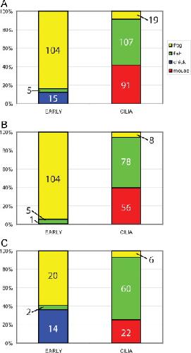 Distribution of studies in CILIA and EARLY treatments by animal model. (A) Distribution of all EARLY and CILIA studies, regardless of endpoint examined. (B) Distribution of studies that examined organ situs. (C) Distribution of studies that examined Nodal localization. For all panels, the number of treatments examined for each animal model is listed on the graphs. The results clearly indicate that a 2-way ANOVA approach is not an appropriate statistical analysis for this dataset because of minimal overlap of animal models between the EARLY and CILIA groups.