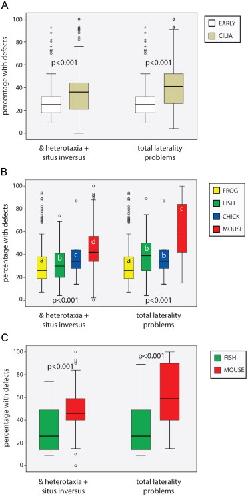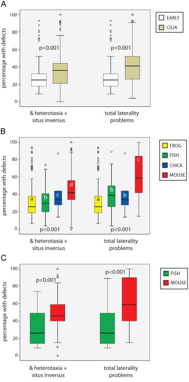 Penetrance of organ situs phenotypes by timing and animal model. Two different measures of organ situs were calculated for comparisons, % heterotaxia+situs inversus and total laterality problems. (A) CILIA treatments produced significantly higher values for both measures of organ situs compared to EARLY treatments. p-values on graph are results of independent samples T-tests using weighted data. (B) There were significant differences in % heterotaxia+situs inversus and total laterality problems by animal model, with mice having significantly more penetrant defects compared to the other three animal models. The difference between % heterotaxia+situs inversus and total laterality problems for mice suggests that isomerisms are a uniquely important class of laterality defects in this animal. p-values on graph are ANOVA values using weighted data; different letters indicate significant differences between groups (Dunnett T3 posthoc test, p<0.01). (C) When the analysis was limited to mutants only, mice still had more penetrant defects for both measures of organ situs compared to fish, the only other animal with significant numbers of mutants available for analysis. p-values on graph are results of independent sample T-tests using weighted data.