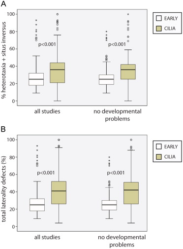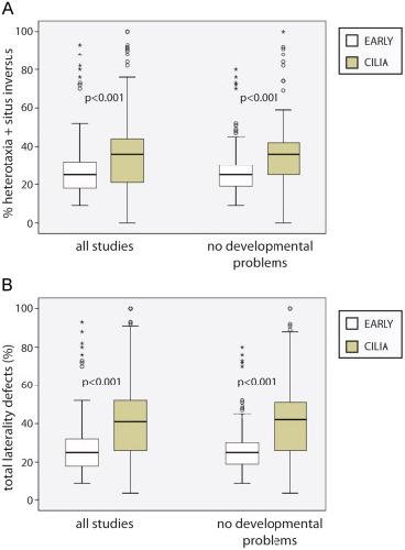 Developmental defects have little influence on penetrance of randomized organ situs. (A) % heterotaxia+situs inversus in all studies compared to this same measure after treatments that cause malformations and developmental defects were removed from analysis. (B) Total laterality problems, again comparing all studies before and after treatments that cause other defects were removed. For both of these measures, the removal of studies that cause developmental defects has very little impact on either EARLY or CILIA treatments, and significant differences between these groups remain. (In both panels, the data shown for “all studies” is the same as reported in Fig. 2A.) p-values on graph are results of independent samples T-tests using weighted data.