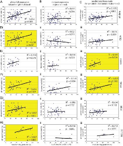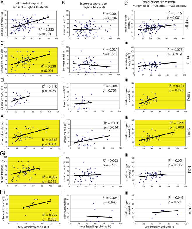 Gene expression can be used to predict organ situs, but is dependent on several factors. Regression analysis indicates that gene expression data can be used to predict organ situs, but only if the correct analysis is chosen based on timing and animal model. For all panels, total laterality problems are graphed along the X axis. For all graphs in the left column, the Y axis represents all non-left nodal expression (the sum of right, bilateral and absent gene expression). For all graphs in the middle column, the Y axis represents incorrect nodal expression (the sum of right and bilateral expression). For all graphs in the right column, the Y axis represents the predicted organ reversal rate derived from reported localization of Nodal. Yellow panels indicate the best fit regressions for each pathway (CILIA and EARLY) and each animal model. Panels A–C show regressions of all data using the three possible comparisons. (Di−iii) The best regression for CILIA treatments is achieved by comparing all non-left nodal expression and total laterality problems. (Ei−iii) The best regression for EARLY treatments is achieved by comparing predicted organ reversal rate and total laterality problems, although this relationship did not reach statistical significance. (Fi−iii) Data from Xenopus fit two models equally well: regressions comparing all non-left nodal expression and total laterality problems and predicted organ reversal rate and total laterality problems. (Gi−iii). Data from fish fit best to the regression between all non-left nodal expression and total laterality problems, but this relationship was not statistically significant. (Hi−iii) Unexpectedly, data collected in mouse do not fit any of the regressions well, suggesting poor associations between asymmetric gene expression and organ laterality in this animal model. The best fit was observed between all non-left nodal expression and total laterality problems.