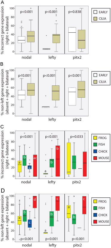 Asymmetric gene expression is influenced by how it is calculated, timing, and animal. (A) When only right and bilateral gene expression were included in calculations, there were significant differences in incorrect gene expression between CILIA and EARLY treatments for two of the three genes examined. (B) When right, bilateral and absent gene expression were included in calculations, there were significant differences in all non-left gene expression between CILIA and EARLY treatments for all three genes examined. (C) Incorrect gene expression was influenced by animal model for all three genes examined, although the differences in pitx2 did not reach statistical significance. p-values are ANOVA statistics of weighted data; different letters indicate significant differences between groups (Dunnett T3 posthoc test, p<0.01). (D) All non-left gene expression was significantly affected by animal model, with mice being the most different. p-values are ANOVA statistics; different letters indicate significant differences between groups (Dunnett T3 posthoc test, p<0.01). For lefty, there were no samples collected in chick. For pitx2, there was only 1 sample for chick, so this group was excluded from analysis.