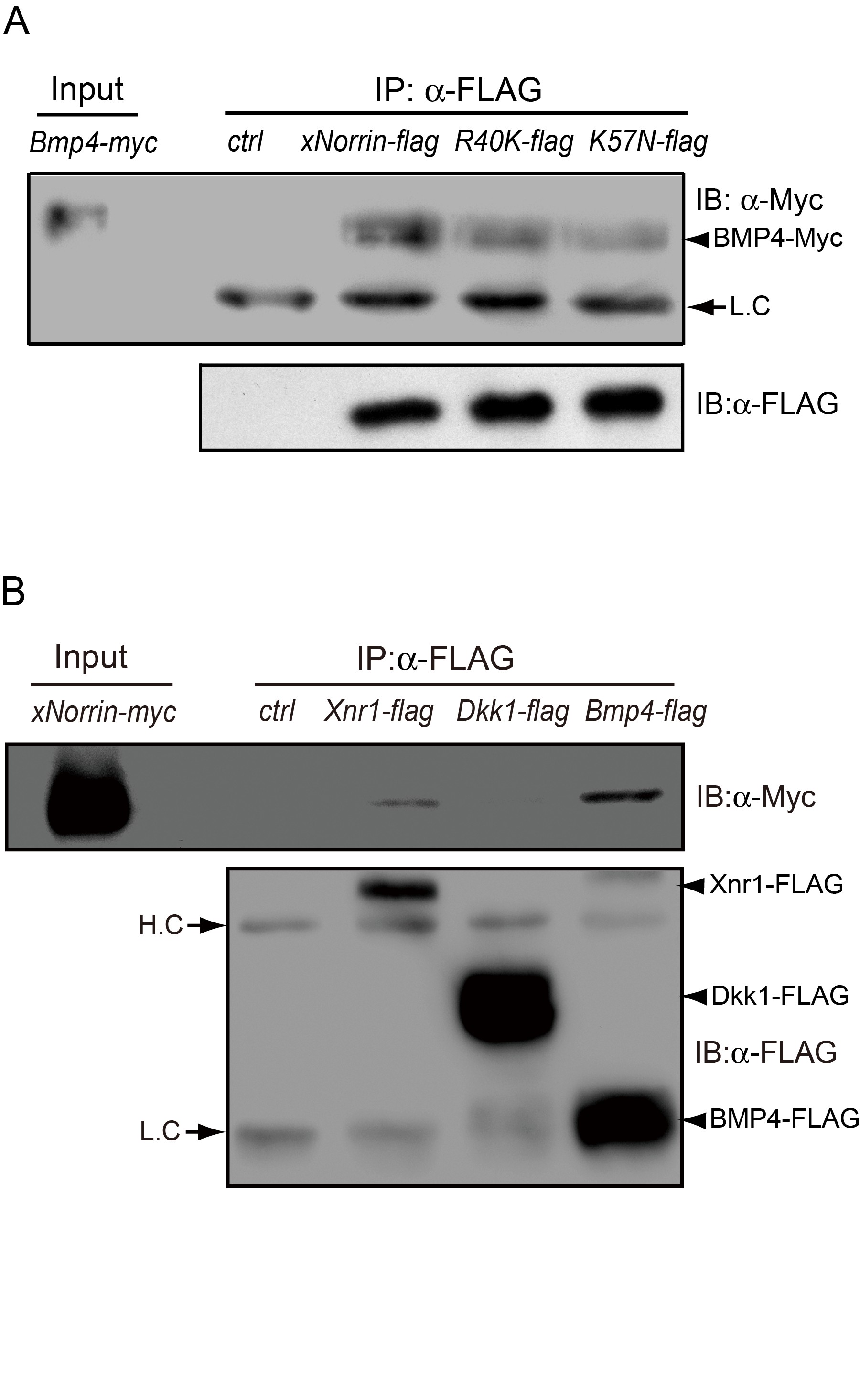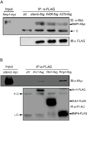 Figure S6. xNorrin interacts with TGF-β family members. (A) xNorrin binds to BMP4. Epitope-tagged wild-type xNorrin or xNorrin point mutants (R40K or K57N) and BMP4 were separately expressed in HEK293 cells. The conditioned medium from cells expressing individual xNorrin and BMP4 were mixed and incubated. The FLAG-tagged protein complexes were immunoprecipitated using an anti-FLAG antibody and separated in SDS-PAGE and blotted. An anti-c-Myc antibody was used to detect Myc-tagged BMP4. The expression of FLAG-tagged proteins was detected using an anti-FLAG antibody. xNorrin was shown to bind to BMP4. The R40K mutant retained this binding activity, while the K57N mutant showed slightly reduced BMP4 binding. Conditioned medium of the parent FLAG-plasmid-transfected cells was used as a control (ctrl). Arrowhead, BMP4-Myc; arrow, immunoglobulin light chains (LC). α-FLAG, anti-FLAG tag monoclonal antibody; α-Myc, anti-c-Myc-tag monoclonal antibody. (B) xNorrin binds to Xnr1 but not DKK-1. The assay performed was similar to that described in (A). Conditioned medium (ctrl) was the same as in (A). Arrowheads indicate FLAG-tagged protein. Arrows point to immunoglobulin heavy chain (HC, top) and light chain (LC, bottom). |