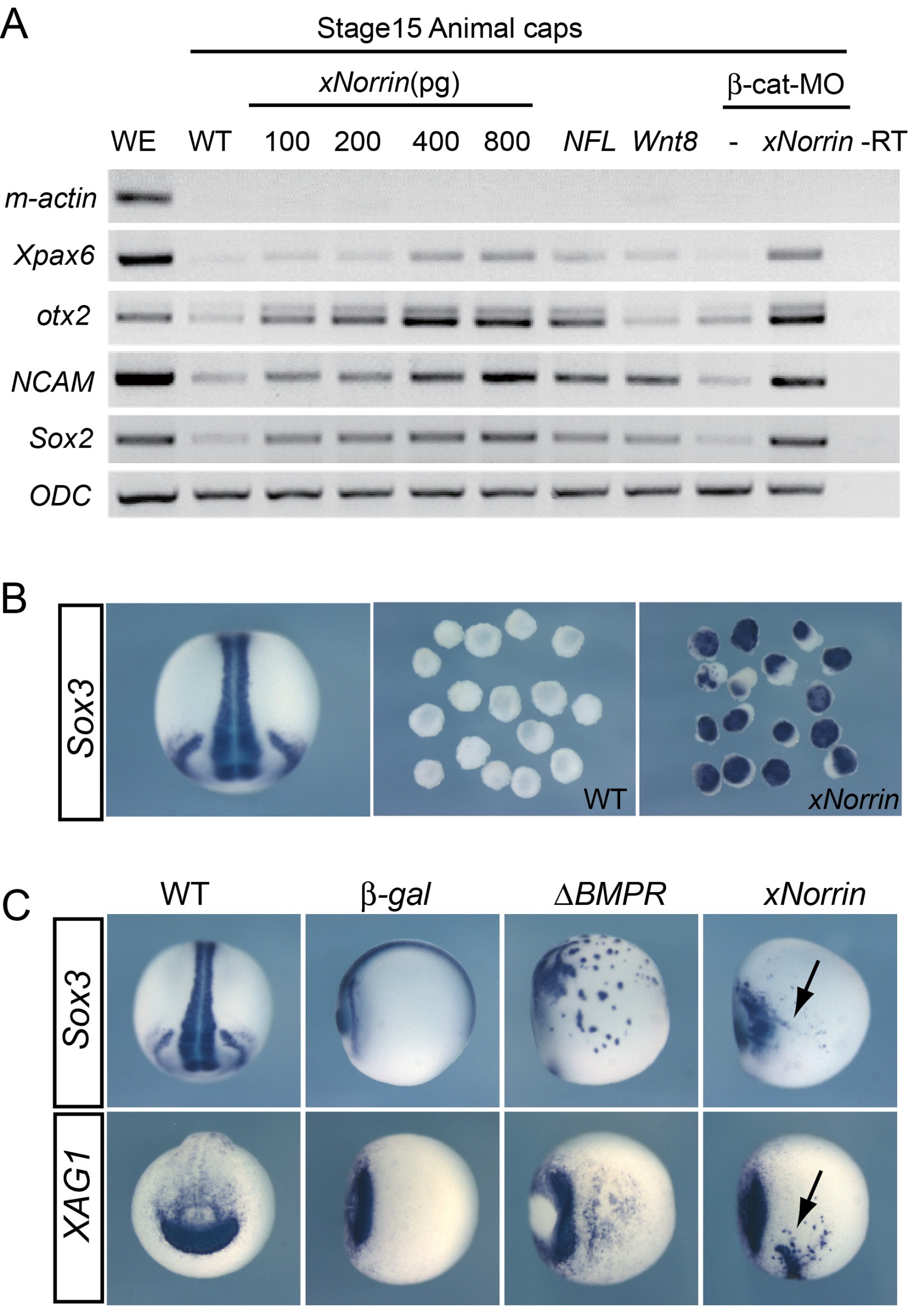 Figure 6. xNorrin induces neural formation independent of β-catenin signaling. (A) xNorrin dose-dependently induced neural marker (Xpax6, otx2, NCAM, and Sox2) expression. The induction is independent of mesoderm formation (m-actin: muscle actin) and could occur in the presence of a β-catenin-MO. RNA and MO were injected at the one-cell stage, and the caps were dissected around stage 8 and cultured until they reached stage 15. -RT, no reverse transcription; WE, whole embryo; WT, wild-type. (B) xNorrin induced Sox3 expression in animal caps (89% of xNorrin injected caps showed the expression, n = 45). xNorrin mRNA (300 pg) was injected into the animal pole of two-cell embryos. Sox3 expression in stage 15 animal caps was analyzed with in situ hybridization. WT, wild-type animal caps; xNorrin, xNorrin-mRNA-injected caps. (C) xNorrin induced the expression of ectopic neural and anterior markers in whole embryos. xNorrin mRNA (300 pg) was injected into the ventral animal tier cells of 32-cell embryos. Expression of Sox3 (by δBMPR: 80%, n = 30; by xNorrin: 73%, n = 30) and XAG1 (by δBMPR: 69%, n = 35; by xNorrin: 79%, n = 34) were induced at ectopic sites. β-gal, β-gal-mRNA-injected embryos; δBMPR: δBMPR-mRNA-injected embryos; WT, wild-type uninjected embryos; xNorrin: xNorrin-mRNA-injected embryos. Arrows: ectopically induced Sox3 or XAG1. Sox3 expression in wild type is shown in a dorsal view, while XAG1 expression in wild type is shown in an anterior view. All other embryos are shown in a ventral view, except the embryo in the β-gal/Sox3 panel, which is in a lateral view. |