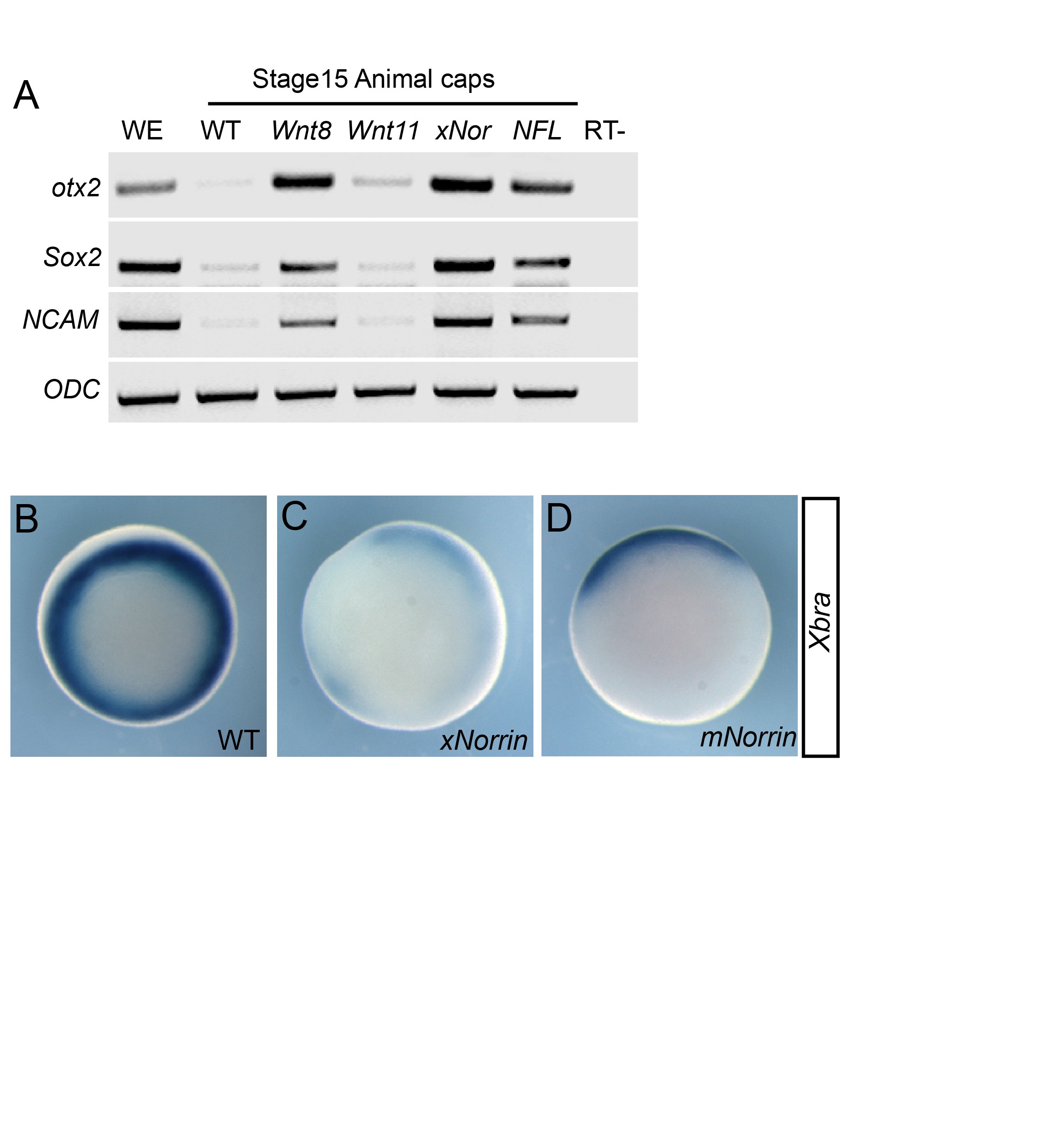 Figure S5. xNorrin induces neural formation and inhibits mesoderm formation. (A) RT-PCR analysis of neural gene expression in stage 15 animal caps from embryos injected with Wnt8 (20 pg), Wnt11 (200 pg), xNorrin (xNor) (200 pg), and NFL (200 pg each). The expression of otx2, Sox2, and NCAM (all neural markers) was analyzed. ODC served as a loading control. (B-D) Xbra expression detected in whole-mount in situ hybridization. A wild-type embryo at stage 10.5 (B); reduced Xbra expression in stage 10.5 embryos injected with xNorrin RNA (200 pg) at the vegetal pole at the two-cell stage (82% reduced, n = 34) (C); reduced Xbra expression in stage 10.5 embryos injected with mouse Norrin RNA (200 pg) at the vegetal pole at the two-cell stage (66% reduced, n = 36) (D). |