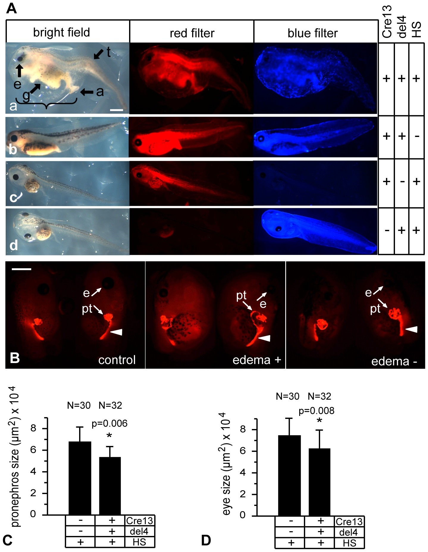 Figure 1. Effects of gastrula-stage overexpression of the P328L329del HNF1b mutation on larval development. Representative larvae of crossings between heterozygous HSPCre13 males and heterozygous 328del4 females. The F1 offspring were heat-shocked for two hours at 34uC at early gastrula (stage 11). Embryonic development was monitored until the larvae were free swimming at stage 416. A: (a) Representative deformed larva after heat-shock activated overexpression of the P328L329del mutation. (b): Double-transgenic control larva without heat-shock treatment (HS). (c) and (d): Control larvae lacking either the effector (c) or the activator (d) transgene. Black arrows indicate misformed structures and tissues. Abbreviations: g: abnormal gut, a: thickened anus, e: smaller eye, t: abnormal tail, bracket: edema. Red fluorescence: HSPCre13 positive animals. Blue fluorescence: 328del4 positive animals. B: Pronephros defects caused by overexpression of the P328L329del HNF1b mutation. Larvae were immunostained with a mixture of the 3G8 and 4A6 antibodies to visualize the entire pronephric kidney. For each larvae, both pronephric kidneys are shown. Mutant animals with or without edemas developed malformations of the pronephros and the eyes. Abbreviations: e, eye; pt, proximal tubules. White arrowheads indicate more distal parts of the pronephric kidney (pronephric duct). C and D: Quantitation of the average pronephric kidney (C) and eye sizes (D) in mutant and control animals. * = p,0.01 (Student t-test). N refers to the number of single pronephri or eyes that were measured. Scale bar = 1 mm.