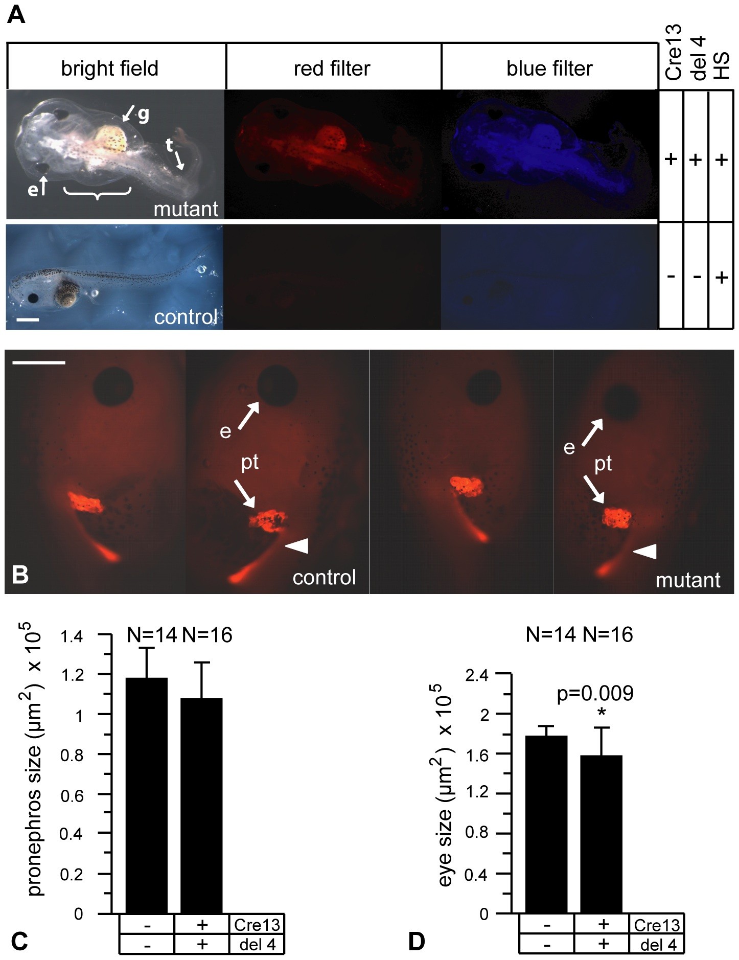 Figure 2. Effects of neurula-stage overexpression of P328L329del HNF1b mutation on larval development. Representative larvae of crossings between heterozygous HSPCre13 males and heterozygous 328del4 females. The F1 offspring were heat-shocked for two hours at 34uC at neurula (stage 19). A: Comparison of a larva with overexpressing the P328L329del HNF1b mutation with a non-transgenic control. Abbreviations: g, abnormal gut; e, reduced eye; t, abnormal tail; bracket: edema. Red fluorescence: HSPCre13 transgene. Blue fluorescence: 328del-4 transgene. HS: heat-shock treatment. The development of control larvae lacking either the effector or the activator transgene was not affected (data not shown). B: Analysis of the pronephric kidneys after overexpression of P328L329del HNF1b mutation at neurula stage. Mutant animals developed malformations of the eyes. Abbreviations: e, eye; pt, proximal tubules. White arrowheads indicate more distal parts of the pronephric kidney (pronephric duct). C and D: Quantitation of the average pronephric kidney (C) and eye sizes (D) in mutant and control animals. * = p,0.01 (Student t-test). N refers to the number of single pronephri or eyes that were measured. Scale bar = 1 mm.
