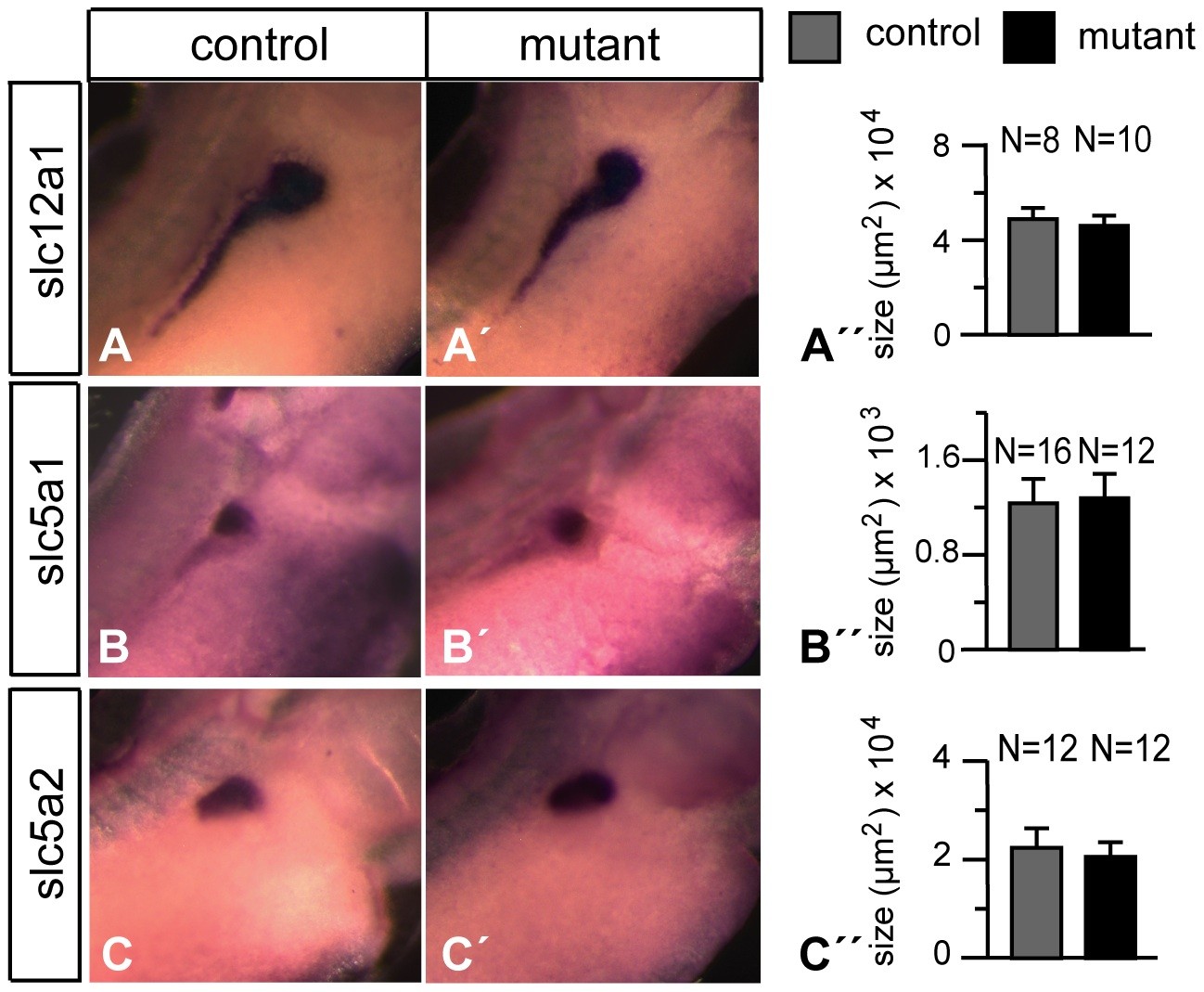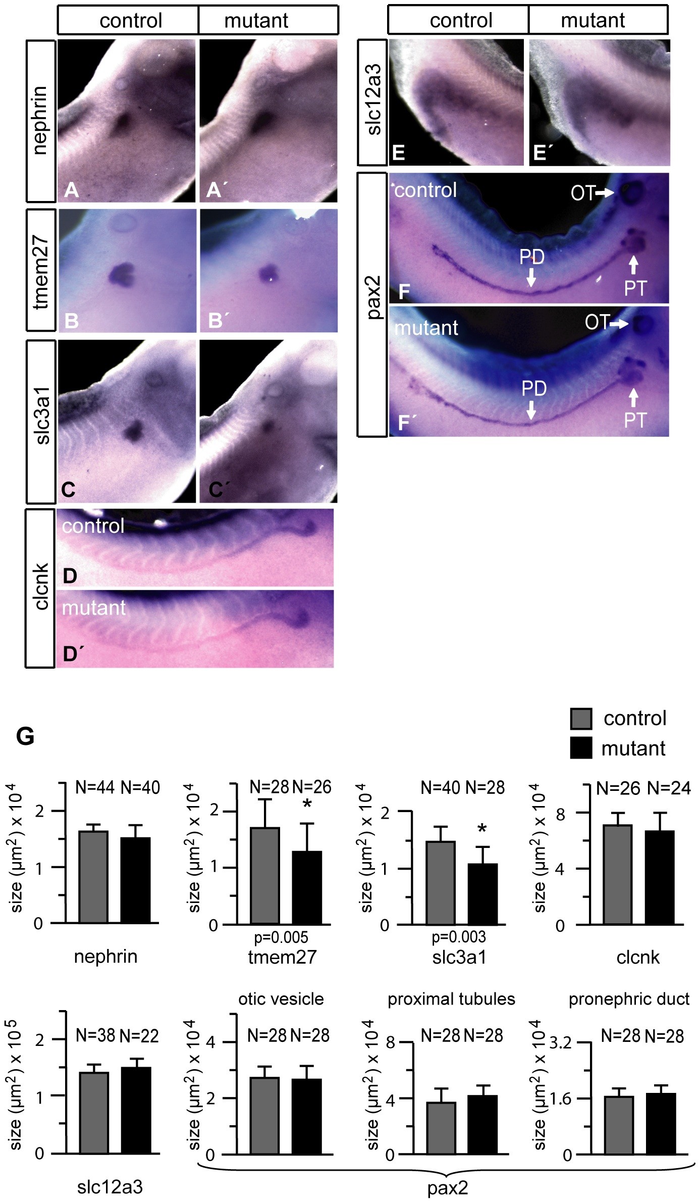 Figure 4. Analysis of nephron segment marker gene expression in larvae overexpressing P328L329del HNF1b mutation. Whole mount in situ hybridization of non-transgenic controls (A) and mutant animals (A99) heat-shocked at early gastrula stage were performed for the indicated marker genes. A00: Quantitation of the marker gene expression domains in mutant and control animals. * = p,0.01 (Student t-test). N refers to the number of measurements performed.