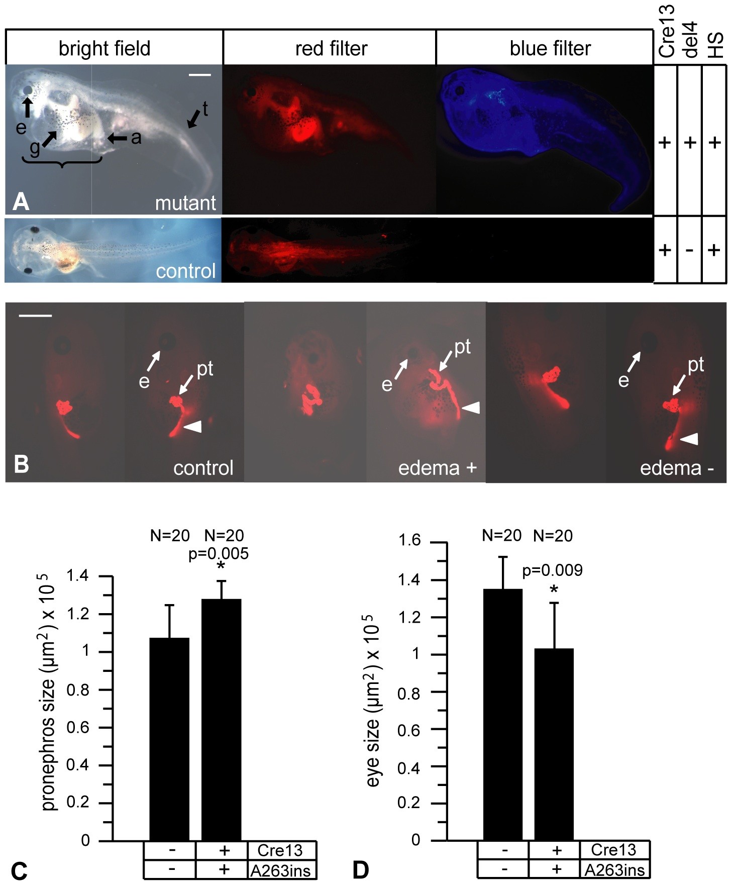 Figure 5. Effects of overexpressing the A263insGG HNF1b on larval development. Representative larvae of a crossing between heterozygous HSPCre13 males and heterozygous A263ins6 females. The F1 offspring were heat-shocked for two hours at 34uC at early gastrula (stage 11). A: Comparison of a larva overexpressing the A263insGG HNF1b mutation with a non-transgenic control. Abbreviations: a: thickened anus; g: abnormal gut; e: reduced eye; t: abnormal tail; bracket: edema. Red fluorescence: HSPCre13 transgene. Blue fluorescence: 328del4 transgene. HS: heat-shock treatment. B: Analysis of the pronephric kidneys overexpressing the A263insGG HNF1b mutation Mutant animals with or without edemas developed malformations of the pronephric kidneys and the eyes. Abbreviations: e: eye; pt: proximal tubules. White arrowheads indicate more distal parts of the pronephric kidney (pronephric duct). C and D: Quantitation of the average pronephric kidney (C) and eye sizes (D) in mutant and control animals. * = p,0.01 (Student t-test). N refers to the number of single pronephri or eyes that were measured. Scale bar = 1 mm.