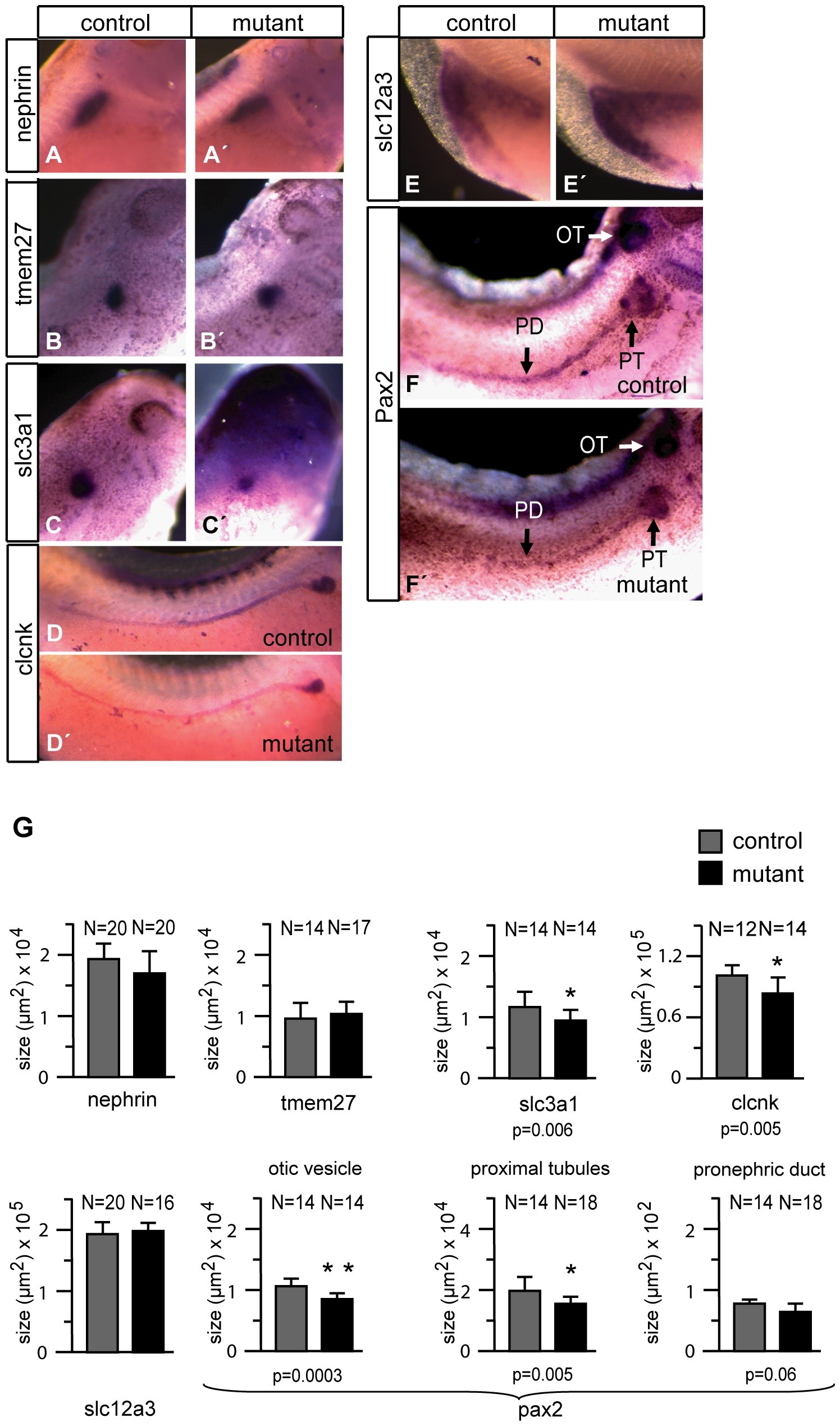 Figure 3. Analysis of pronephric marker gene expression in larvae overexpressing P328L329del HNF1b mutation. Whole mount in situ hybridization of non-transgenic controls (A) and mutant animals (A99) heat-shocked at early gastrula (stage 11) were performed for the indicated markers. Abbreviations: OT: otic vesicle: PT, proximal tubules; PD: pronephric duct; G: Quantitation of the marker gene expression domains in mutant and control animals. * = p,0.01 (Student t-test). N refers to the number of measurements performed.
