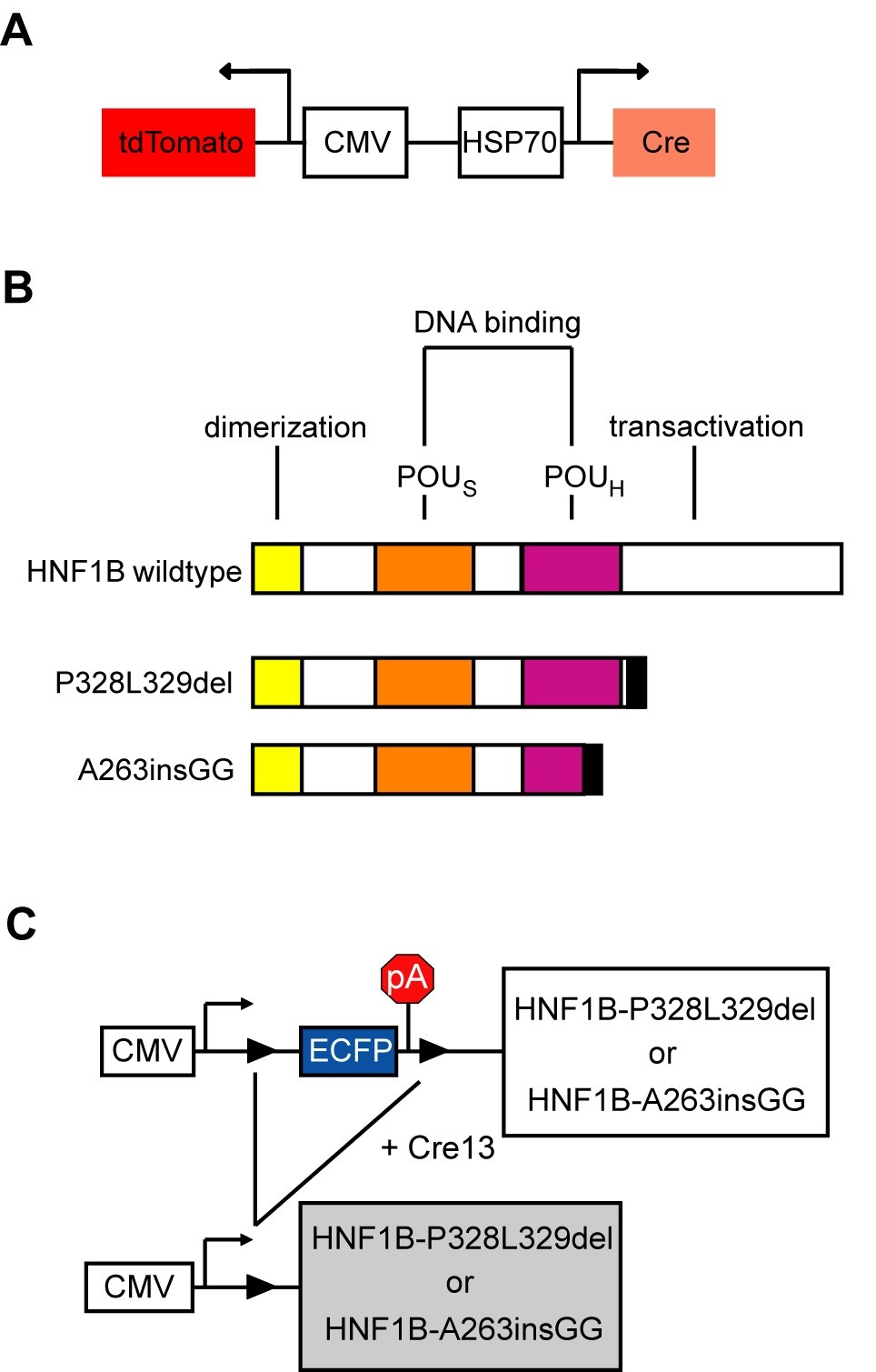 Cre activator and effector strains for the overexpression of HNF1β mutants. A: Scheme of the construct present in the HSPCre13 activator strain. Located on the same plasmid, Cre recombinase is under the control of the HSP70 promotor, whereas expression of the tdTomato reporter gene is driven by the CMV promotor. B: Domain structure of HNF1β and its mutant derivatives P328L329del and A263insGG. POUS and POUH refer to the POU specific domain and POU homeodomain, respectively. C: Scheme of the transgenic effector constructs used in the present study. The CMV-driven blue fluorescent protein ECFP is used as a reporter. It is flanked by loxP sites (black triangles) followed by the open reading frame of HNF1β harboring either the P328L329del mutations (328del4 strain) or the A263insGG mutation (A263ins6 strain). Successful recombination of the effector construct upon HSPCre13 activation leads to the expression of either P328L329del or A263insGG. The effector strains contain in addition a FRT site, which is not shown here [20].