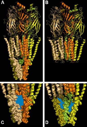 Figure 1. The MA-helix structure in the M3–M4 loop region and the portals into the channel’s cytoplasmic vestibule using the 4-Å resolution cryo-EM nicotinic ACh receptor structure (Protein Data Bank accession no. 2BG9). Only the MA-helix portion of the M3–M4 loop region structure was resolved. (A) The entire receptor structure is shown, including the largely β-strand extracellular domain, the largely α-helical membrane-spanning domain, and the cytoplasmic MA helix. The first two domains are shown in ribbon cartoon representation, whereas the MA helix is shown in space-filling representation. Each subunit is shown in a different color for illustrative purposes. (B) The structure after removal of the cytoplasmic M3–M4 loop domain. (C) Close-up view from the cytoplasm of a portal into the channel’s cytoplasmic vestibule. The portal region that ions would traverse to enter or leave the vestibule is colored blue. (D) View of the channel’s cytoplasmic vestibule. The MA helices from the front two subunits (orange and tan) have been removed to visualize the cytoplasmic vestibule and the cytoplasmic mouth of the channel. The portals between the MA helices of the remaining three subunits are colored blue. Figure constructed with PyMOL version 1.4.1 and Photoshop version 10.0.1.