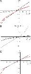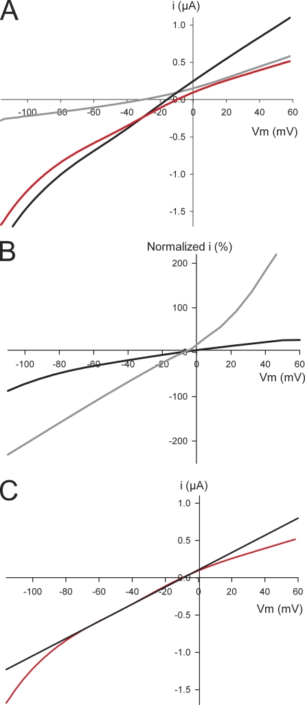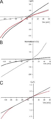 Figure 2. (A) I-V ramp (red) for a WT 5-HT3A receptor. Red curve is the background-subtracted I-V ramp of an oocyte expressing WT 5-HT3A receptor. It is the I-V ramp in the presence of 5-HT (black) minus a ramp in the absence of 5-HT (gray). (B) Normalized I-V ramps from a single oocyte at subsaturating (0.6 µM; black line) and saturating (10 µM; gray line) 5-HT concentrations. Both currents are normalized to the maximum current at −120 mV for the subsaturating 5-HT concentration (−1.8 µA). The maximum current for the saturating 5-HT concentration at −120 mV is −4.5 µA. (C) Tangent line (black) shown on the linear portion from −70 to −30 mV of a WT 5-HT3A I-V curve (red).