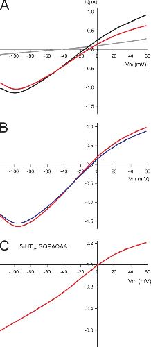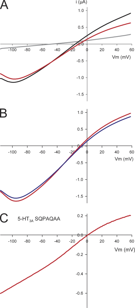 Figure 3. Characterization of the negative slope conductance of the 5-HT3A–glvM3M4 receptor. (A) I-V ramp (red) for a 5-HT3A–glvM3M4 receptor demonstrating the negative slope conductance at the more negative voltages. Red curve is the background-subtracted I-V ramp of an oocyte expressing 5-HT3A–glvM3M4 receptor. It is the I-V ramp in the presence of 5-HT (black) minus a ramp in the absence of 5-HT (gray). All other I-V curves shown are the background-subtracted curves. (B) I-V curves for a 5-HT3A–glvM3M4 receptor in the presence of 1 mM EGTA (blue) and the absence of EGTA (red). (C) I-V curve for the 5-HT3A–SQPAQAA. The negative slope conductance is not present when the Arg residue is removed from the M3–M4 loop. A 5-HT EC30 concentration (400–1,200 nM) was used for the experiments and determined for each oocyte expressing 5-HT3A receptors.