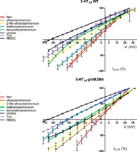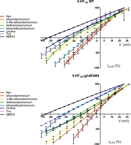 Figure 4. The effect of substitution of Na+ with organic cations on the I-V relationship of 5-HT3 receptors at saturating concentrations of 5-HT (50 µM). (Top) 5-HT3A WT receptors. (Bottom) Chimeric 5-HT3A–glvM3M4 receptors. Data points at each potential sample are plotted as the mean normalized current ± SEM along with the interpolated fit through the points. The data were normalized for clarity to the current at either +31 or +37 mV, dependent on the exact protocol used.