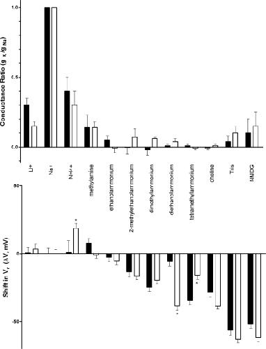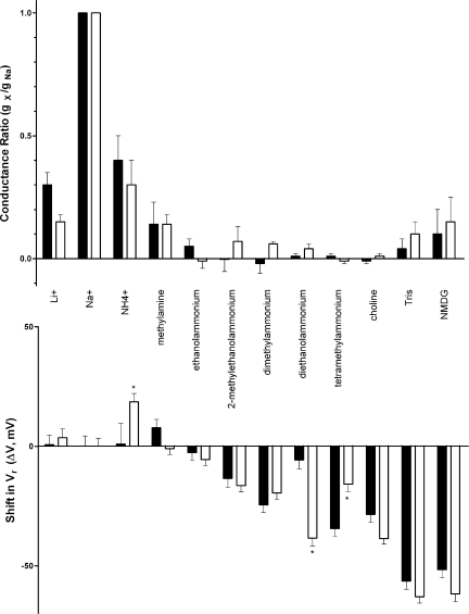 Figure 5. Shifts in the reversal potential of I5-HT and changes in relative conductance upon substitution of Na+ with inorganic and organic cations in oocytes expressing either 5-HT3A WT (filled bars) or chimeric 5-HT3A–glvM3M4 (open bars) receptors. (Top) Conductance ratios were calculated taking the slope across the voltage range of −70 to −30 mV for each cation and dividing by the Na+ slope. (Bottom) Reversal potentials derived from the data in Table I were subtracted from those determined in 98 mM Na+ for each subunit. Where a significant difference in ΔVr was observed between the two receptors tested, it is marked with an asterisk (*, P < 0.01; two way ANOVA).
