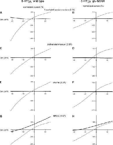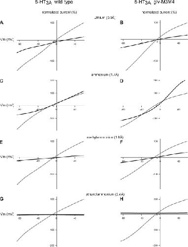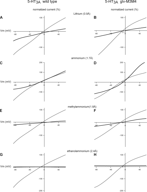 Figure 6. Comparison of the I-V relationship of the WT 5HT3A and chimeric 5-HT3A–glvM3M4 receptor in cations ≥2.4-Å radius. Normalized I-V relationships for WT 5-HT3A in external 98 mM of Na+ solution (gray) or external 98 mM of cation solution (black). (A, C, E, and G) WT 5HT3A and (B, D, F, and H) 5-HT3A–glvM3M4 receptors. (A and B) Li+, (C and D) NH4+, (E and F) methylammonium, and (G and H) ethanolammonium. Both receptors are permeant to cations of <2.4 Å. Subsaturating concentrations of 5-HT were used in these experiments.