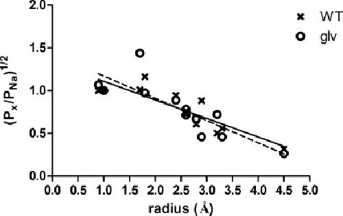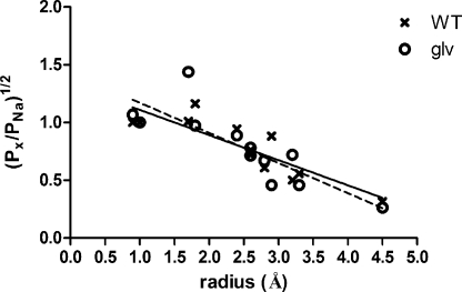 Figure 8. The relationship between relative permeability and ionic radius in 5-HT3 receptors. Plot of the square root of the relative permeability against ionic radius for the series of cations in Table I, along with linear regression lines for each dataset: solid line, WT; dashed line, 5-HT3A–glvM3M4. Note that two cations share the same calculated radius at 2.6 Å, and that the measured relative permeabilities are similar. NMDG, which was impermeant, was excluded from the linear regression analysis. The ammonium results were also excluded because of the large difference between the two channels and the confounding effects of ammonium ion substitution on the oocyte endogenous currents.