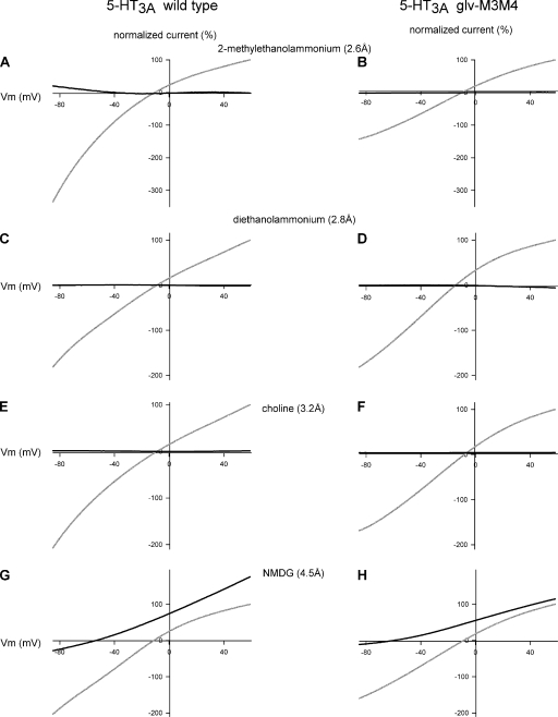 Figure 7. Comparison of I-V relationships for WT 5-HT3A and chimeric 5-HT3A–glvM3M4 receptors for cations between 2.6 and 4.5–Å radius. Normalized I-V relationship for WT 5-HT3A in external 98 mM of Na+ solution (gray) or external 98 mM of cation solution (black). (A, C, E, and G) WT 5HT3A and (B, D, F, and H) 5-HT3A–glvM3M4 receptors. (A and B) 2-Methylethanolammonium, (C and D) diethanolammonium, (E and F) choline, and (G and H) NMDG. Neither receptor is significantly permeable to cations of >4.5-Å radius. The midsized cations (between 2.6 and 4.5 Å) had flat I-V relationships, possibly from the cation blocking the pore or from the cation acting as competitive antagonists at the 5-HT–binding site. Subsaturating concentrations of 5-HT were used in these experiments.
