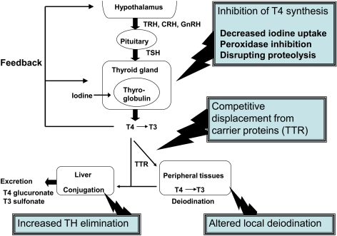 Endocrine disrupting chemicals: interference of thyroid hormone binding to transthyretins and to thyroid hormone receptors.