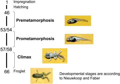 Fig. 3. The stage of metamorphosis is divided into 3 stages. The premetamorphic stage is the period until the appearance of the hind limbs, and the prometamorphic period is from their appearance to that of the forelimbs. During the period of metamorphic climax, resorption of the tail and gills and development of lungs occur.