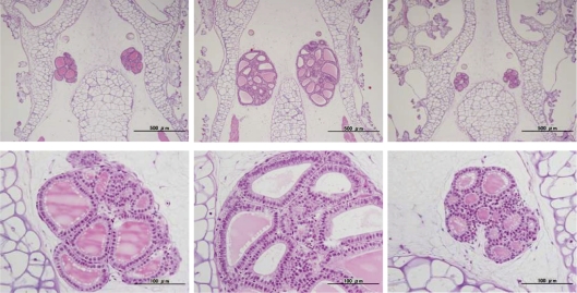 Fig. 4. Thyroid glands after exposure for 21 days beginning at Stage 51. Left: Control. Middle: PTU 25 ppm. Right: T4 5.0 ppb.