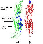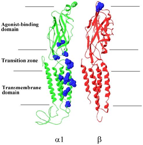 Figure 1. Distribution of hereditary hyperekplexia-causing mutations in the GlyR α1 and β subunits.The hereditary hyperekplexia-causing mutations that disrupt the GlyR channel function rather than block surface expression, are mapped onto the structure models [3] of GlyR α1 (A52S, E103K, R218Q, S231N, I244N, P250T, V260M, T265I, Q266H, S267N, R271L/Q, K276E and Y279C) and β (G229D) subunits.
