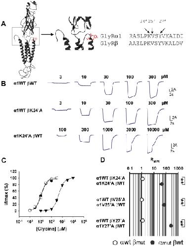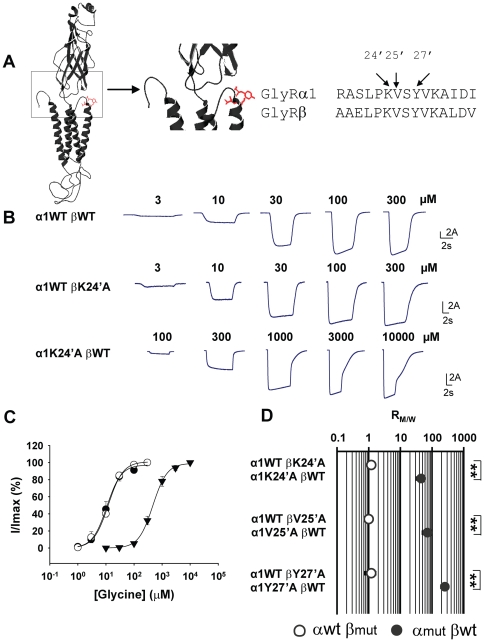 Figure 2. Effects of M2–M3 loop mutations on α1 β GlyR channel function.(A) The positions where mutations were introduced, K24′, V25′ and Y27′, are shown in red in a structure model of the GlyR α1 subunit (left panel). Their positions are also indicated in the amino acid sequences of the M2–M3 loops of the α1 and β subunits (right panel). (B) Example traces of currents induced by increasing glycine concentrations in the indicated receptors. (C) Averaged normalized glycine concentration–response curves for the α1WT βWT GlyR (•),α1WT βK24′A GlyR (○) and the α1K24′A βWT GlyR (▾). (D) The RM/Ws (the EC50 of the mutant α1 β GlyR divided by the EC50 of the WT α1 β GlyR) resulting from introducing the K24′A, V25′A or Y27′A mutation into the α1 (•) and β (○) subunits are shown. (** p<0.01 using the Student's t-test).