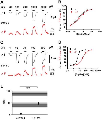 Figure 3. VCF of α1 β GlyRs.Example current and fluorescence traces of the α19′C β and α β19′C GlyRs are shown in (A) and (C), respectively. Averaged normalized glycine concentration-response curves of current and fluorescence of the α19′Cβ and α β19′C GlyRs are shown in (B) and (D), respectively. The RF/Is (the EC50 of fluorescence divided by the EC50 of current) of the α19′C β and α β19′C GlyRs are plotted (E). (** p<0.01 using the Student's t-test).