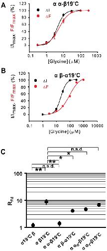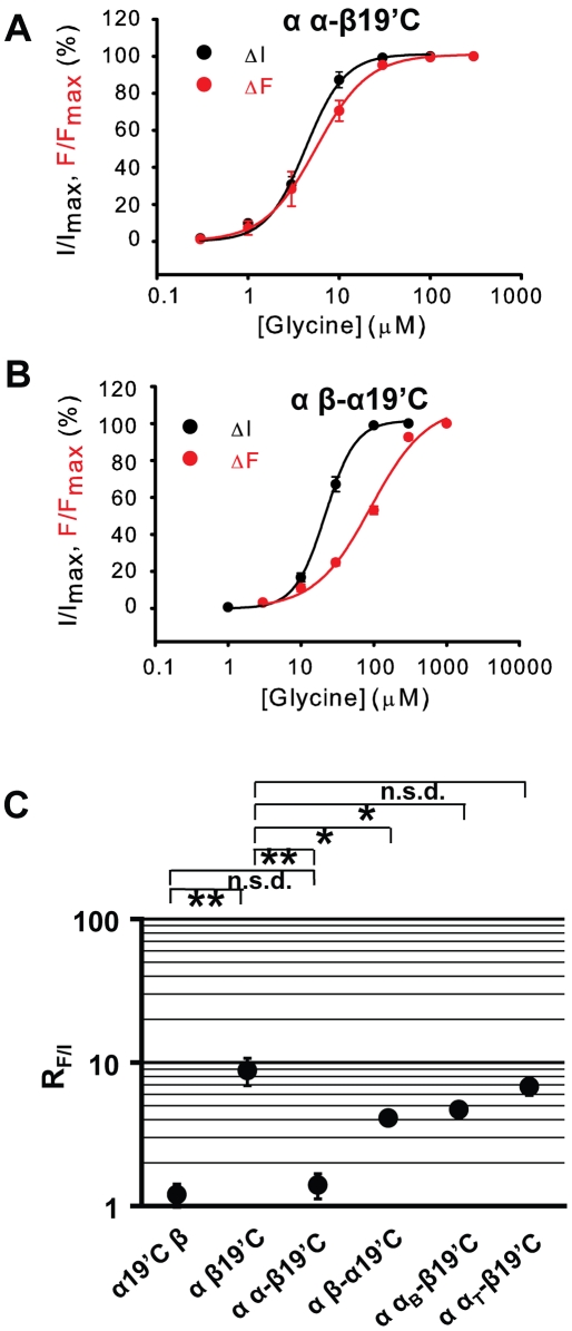 Figure 5. VCF of chimeric α1 β GlyRs.Averaged, normalized glycine concentration-response curves of current and fluorescence of α α-β19′C and α β-α19′C GlyRs are shown in (A) and (B), respectively. (C) The RF/Is (the EC50 of fluorescence divided by the EC50 of current) of the α19′C β, α β19′C, α α-β19′C, α β-α19′C, α αB-β19′C and α αT-β19′C GlyRs are plotted. (* p<0.05; ** p<0.01; n.s.d. not significantly different, using the Student's t-test).