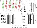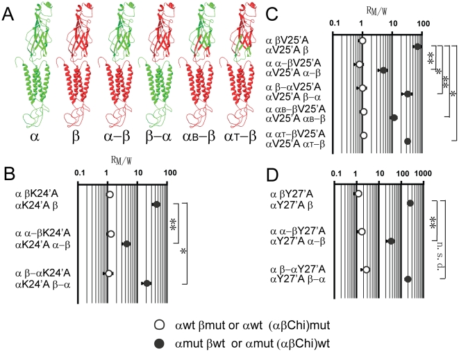 Figure 4. Effects of M2–M3 loop mutations on chimeric α1 β GlyR channel function.(A) The molecular identity of each chimera is schematically illustrated, with green and red denoting α1 and β subunit sequences, respectively. (B–D) The RM/Ws (the EC50 of the mutant chimeric α1 β GlyR divided by the EC50 of its relevant WT chimeric α1 β GlyR) resulting from introducing the K24′A, V25′A or Y27′A mutation. The symbol (○) represents constructs containing WT α1 and mutant β or other indicated chimeric subunit, while the symbol (•) represents constructs containing mutant α1 and WT β or other indicated chimeric subunit. (* p<0.05; ** p<0.01; n.s.d. not significantly different; using the Student's t-test).