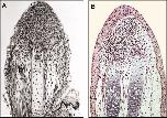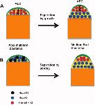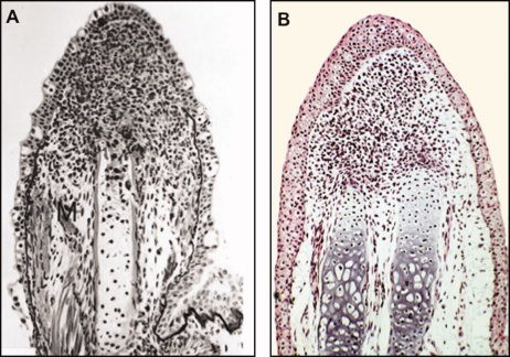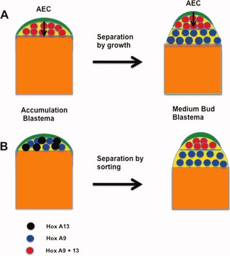Figure 9. Models that link blastema self-organization and expression of Hoxa9/13, which is assumed to be a code for the prospective autopodium (after Stocum, 2006). A:Hoxa9/13 are expressed uniformly in all the cells of the accumulation blastema. Hoxa9 expression is autonomous, but that of Hoxa13 requires factors (arrow) from the AEC. As the blastema grows, its more proximal cells fall outside the range of the AEC factors and express only Hoxa9, the code for the prospective stylopodium. This separates stylopodial and autopodial domains. The code for the prospective zeugopodium is intercalated at the boundary between autopodium and styopodium. B:Hoxa9 and Hoxa9/13 are expressed by separate subsets of cells at accumulation blastema. Hoxa9 and Hoxa9/13 cells have a differential homotypic adhesive affinity and Hoxa9/13 cells have a stronger heterotypic affinity for the AEC. Prospective autopodial and stylopodial domains separated by cell sorting.Download figure to PowerPoint