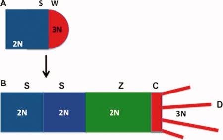 Figure 3. Intercalary regeneration in the PD axis of the axolotl limb (after Pescitelli and Stocum, 1980). A: A triploid (3N) wrist (W) blastema is heterografted to a diploid (2N) upper arm stump (S, stylopodium), discarding the intermediate structures. B: After a delay during which the host limb tissues dedifferentiate and contribute to the blastema, a normal limb is regenerated by the intercalation of the distal stylopodium (bright blue) and the zeugopodium (lower arm, green). Counts of triploid vs. diploid cells show that the 3N graft develops into carpals (C) and digits, whereas the intercalated intermediate structures are the host 2N ploidy.Download figure to PowerPoint