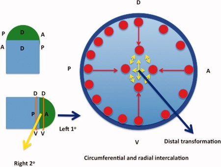 Figure 7. Right: Basic features of the polar coordinate model (after Bryant et al., 1981). Cells from the circumferential arcs of all four quadrants of the amputated limb migrate centripetally (red arrows) and interact to generate circumferential and radial intercalation (yellow arrows), forming a complete cross-section of blastema cells that assume the next distal positional identity. Successive repetitions of this process regenerate the PD axis (dark blue arrow). Left: Upper: Dorsal view of a right limb stump (light blue) to which a left blastema (green) has been grafted, reversing the AP axis. Lower: View from the lateral side of the above construct showing how this graft confronts two half circumferences (orange brackets, DPV of the stump and DAV of the graft). The graft (primary limb) develops with its handedness of origin (blue arrow). A complete right-handed cross-section of blastema cells is generated by radial intercalation within the half circumferences. Repetitive circumferential and radial intercalation/distalization, as in the diagram at the right, regenerates the PD axis. A, anterior; P, posterior; D, dorsal; V, ventral.Download figure to PowerPoint