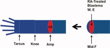 Figure 5. Right: âAffinophoresisâ assay in vivo for blastema cell PD adhesive gradient (after Crawford and Stocum, 1988a). Medium bud stage blastemas derived from the wrist (W), elbow (E), or mid-upper arm (UA) were autografted to a wound bed made at the junction of the stump and a medium bud blastema derived by amputation (Amp) at the mid-femur (F) level of the hindlimb. Left: As the host hindlimb blastema grows and redifferentiates, the wrist and elbow blastemas sort distally to their corresponding tarsal and knee levels, respectively, while the mid-upper arm blastema remains at the amputation level. Download figure to PowerPoint