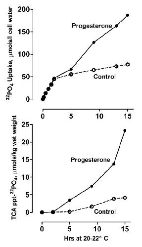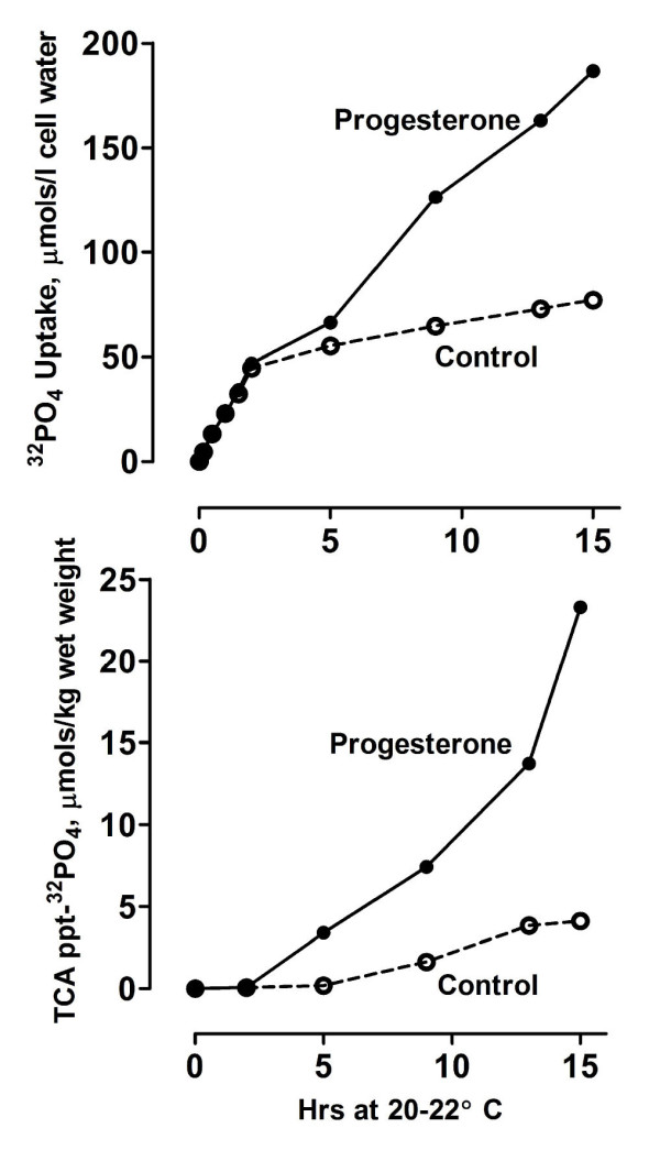 Figure 6. Comparison of 32PO4 uptake by control and progesterone-treated Rana pipiens ovarian follicles. Upper panel: in-vitro [32PO4] uptake by control and progesterone-treated denuded oocytes. Oocytes were incubated in Ringers' solution containing 0.08 mM NaHPO4 and 32PO4 uptake is expressed as μmols/1 cell water. Lower panel: oocytes from the upper panel were homogenized in 7% TCA and protein isolated as described in Methods. 32PO4 uptake into total protein is expressed as μmols/kg wet weight.