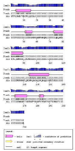 Figure 7. Predicted structure of the frog phosvitin component of Vitellogenin-A2 (1807 amino acids; Accession #P18709). The Protein Structure Prediction Server (PSIPRED) [16] was used to examine the possible conformation of the serine-rich phosvitin sequence (ca. 1126 - 1321). Line 1 indicates the confidence of the prediction, line 2 the relative position of each helix, line 3 whether the residue is part of a helix, strand or coil (see legend), and line 4 indicates the amino acid. Going from N- to C-terminal end, the sequence contains blocks of 38, 8, 28, 13 and 13 serine residues.