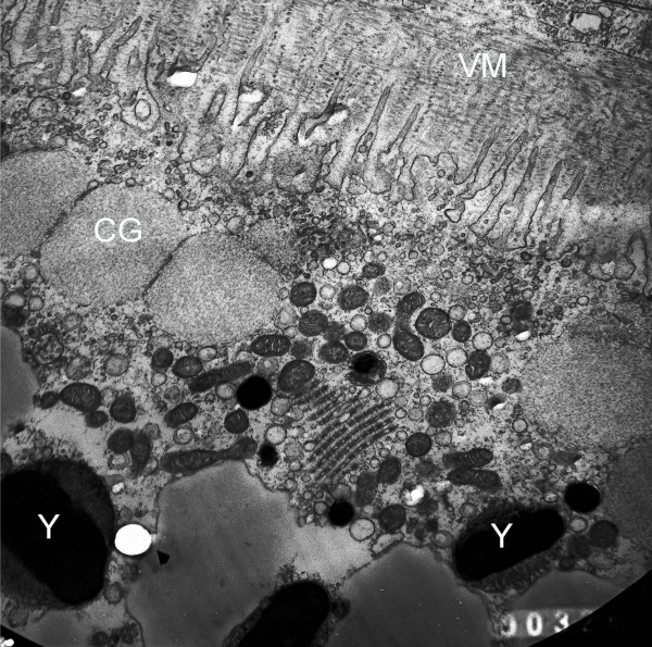 Figure 1. A transmission electron micrograph (×12,000) of a prophase-arrested, untreated ovarian follicle from hibernating Rana pipiens. An area of the oocyte cortex with vitelline membrane (VM), oocyte surface microvilli, cortical granules (CG) and yolk platelets (Y) was selected. Annulate lamellae (membrane array below center of figure), numerous mitochondria and other vesicles are visible. Follicles were fixed sequentially with OsO4 and glutaraldehyde and post-fixed in 1% buffered OsO4 for 1.5 h as described [18]. Samples were embedded in Epon and 50 to 80 nm sections were stained with uranyl acetate and then counter stained with lead citrate. Micrographs were taken using a Jeol 100 CX electron microscope at 80 KV.