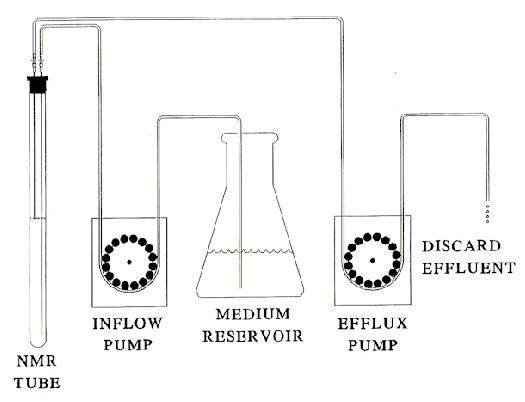 Figure 8. Diagram of the apparatus used to superfuse 200-250 isolated Rana pipiens follicles loosely packed in a 10 mm diameter NMR tube containing modified Ringer's solution. Measurements were made at 20-22°C in Ringers solution with or without progesterone. Using two peristaltic pumps, follicles were continuously superfused by introducing aerated Ringer's solution at the bottom of the NMR tube (1 ml/min) and drawing medium off at the top of the tube. As shown, effluent was discarded and not recycled.
