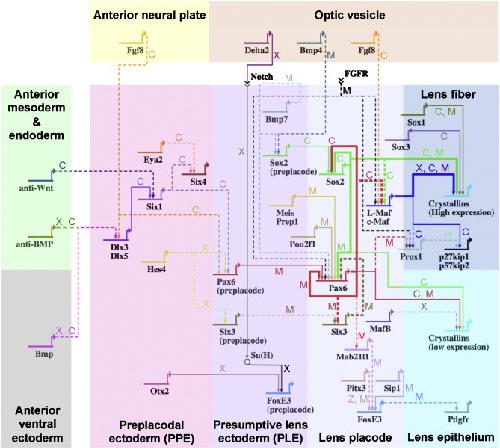 ???displayArticle.abstract??? Lens development is a stepwise process accompanied by the sequential activation of transcription factors. Transcription factor genes can be classified into three groups according to their functions: the first group comprises preplacodal genes, which are implicated in the formation of the preplacodal ectoderm that serves as a common primordium for cranial sensory tissues, including the lens. The second group comprises lens-specification genes, which establish the lens-field within the preplacodal ectoderm. The third group comprises lens-differentiation genes, which promote lens morphogenesis after the optic vesicle makes contact with the presumptive lensectoderm. Analyses of the regulatory interactions between these genes have provided an overview of lens development, highlighting crucial roles for positive cross-regulation in fate specification and for feed-forward regulation in the execution of terminal differentiation. This overview also sheds light upon the mechanisms of how preplacodal gene activities lead to the activation of genes involved in lens-specification.