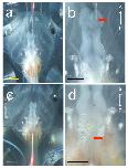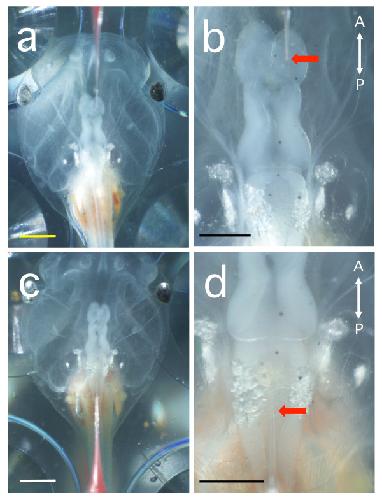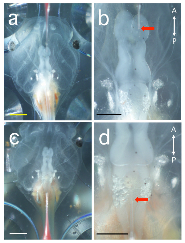 Figure 1. Sites for the injection of polystyrene beads into the ventricles of anesthetised Xenopus larvae. A glass capillary filled with an aqueous suspension of red beads (2.9 μm in diameter) was inserted into the lateral ventricle (a, b) or the fourth ventricle (c, d) for injections. Arrows indicate the injection points. (b, d) magnified views of (a, c), respectively. Scale bars, 1 mm (a, c) and 0.5 mm (b, d).