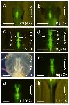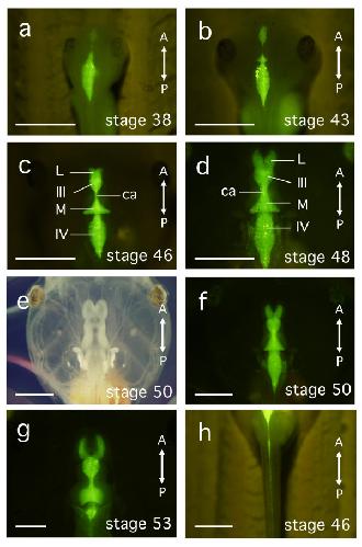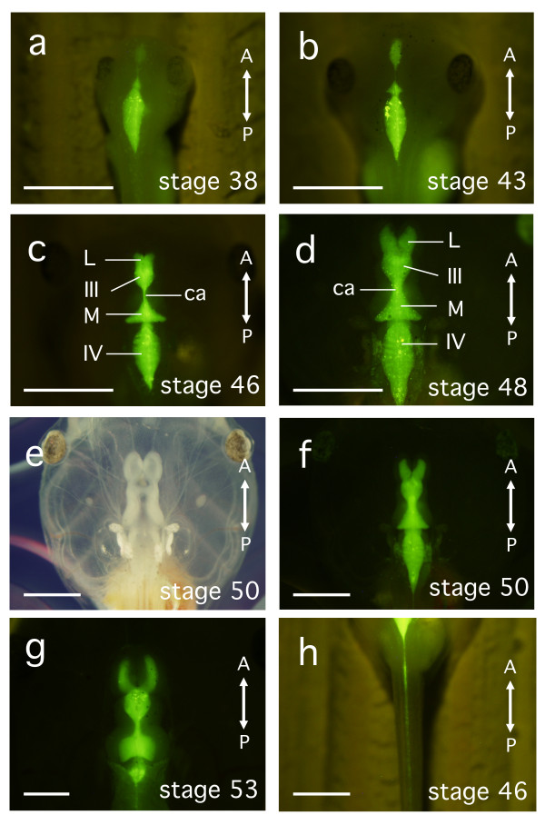 Figure 2. Morphogenesis of the cerebral ventricles during X. laevis development at stages 38-53, visualised by Qdot565 nanocrystals. The injection into the fourth cerebral ventricle of anesthetised embryos labelled the fourth cerebral ventricle almost exclusively in stage 38 (a) and stage 43 (b) embryos. The third cerebral ventricle (III) forms an oval shape by stage 43, and the midbrain ventricle (M) is visible between the fourth and third ventricles by stage 46. The lateral ventricles (L) bud off the third ventricle at stages 46 to 48 (c, d). All ventricles can be recognised clearly at stage 50 (bright-field; e, fluorescence; f). The morphology of the ventricles in stage 53 larvae is different from those of early larval stages (g). The central canal of the spinal cord is also labelled (h). All panels are dorsal views with anterior at the top. Scale bars, 1 mm. ca: cerebral aqueduct.