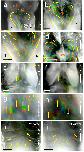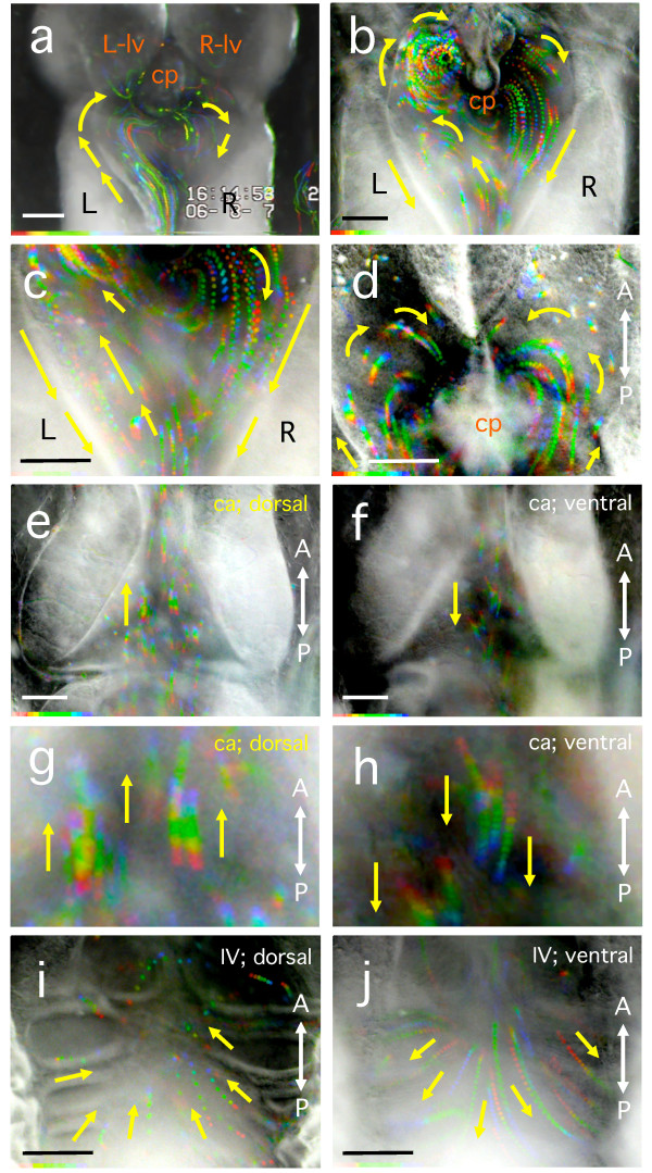 Figure 3. Visualisation of fluid flow by injecting polystyrene beads into the cerebral ventricles of anaesthetised albino X. laevis larvae at stage 47-49. Serial multi-coloured dots represent the trajectories of each bead from 0.7 to 5.3 seconds. The brightness of the video frames are inverted, and the trajectories of the beads were visualised by red - > orange - > yellow - > green - > blue - > purple, in turn, using a combination of Image-J software and its plug-in Color Footprint Rainbow. (a) The beads diffused into the third cerebral ventricle mainly along the left wall of the ventricle just after the injection. (b, c) The beads moved with left-right asymmetrical circulation in the third ventricle (b) and exited through the cerebral aqueduct along the wall of the third ventricle (c). In many individuals, a left-right asymmetry in bead movements in the third ventricle was observed (see Table 1 and Table 2). (d) Within the lateral ventricles, the beads move along the distal walls toward the medial walls creating a semi-circular movement. (e-h) In the cerebral aqueduct, the beads moved rostrally in the dorsal region [(e) and (g) magnified view of (e)] and caudally in the ventral region [(f) and (h) magnified view of (f)]. (i, j) In the fourth ventricle [(i) dorsal side; (j) ventral side], beads tended to concentrate toward the centre and move to the anterior in the dorsal region, whereas beads tended to flow toward the sides and move to the posterior in the ventral region. cp: choroid plexus; lv: lateral ventricle; ca: cerebral aqueduct (aqueduct of Sylvius). All panels are dorsal views (see Additional file 1: movie 1, Additional file 2: movie 2, Additional file 4: movie 4, Additional file 5: movie 5, Additional file 6: movie 6, Additional file 7: movie 7, Additional file 8: movie 8, and Additional file 9: movie 9). Duration of recording; (a) 5.3 sec; (b) 1.0 sec; (c) 0.9 sec; (d) 1.2 sec; (e) 0.9 sec; (f) 0.7 sec; (i) 1.5 sec; (j) 2.6 sec. Scale bars, 0.1 mm.