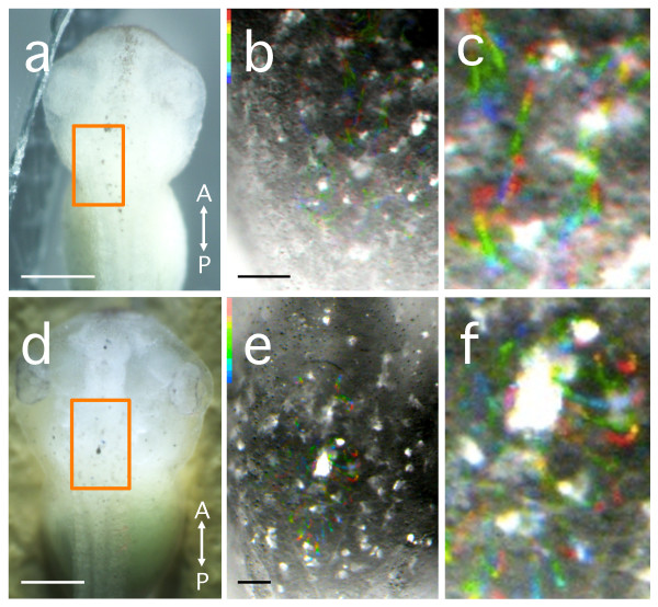 Figure 4. Visualisation of bead movements injected into the fourth ventricle within the fourth ventricle in stage 39 (a-c) and stage 42 (d-f) anaesthetised non-feeding embryos. Anterior is to the top. (a) Bright-field image of a stage 39 embryo (dorsal view). Orange box indicates the area of recording in (b). (b) Trajectories of the beads (diameter = 5.8 μm) within the fourth ventricle are shown in a separate embryo (dorsal view). The trajectories show the existence of some flow, but a discrete pattern was not apparent. (c) Magnified view of (b). Note the non-directional bead movements. (d) Bright field image of a stage 42 embryo (dorsal view). (e) Trajectories of the beads (diameter = 5.8 μm) within the fourth ventricle in the same embryo (dorsal view). Note that a radial CSF flow, from the centre of the ventricle toward the wall, is generated at stage 42. (f) Magnified view of (e). See Additional file 10: movie 10. Duration of recording; (b) 2.7 sec; (e) 0.9 sec. Scale bars, 0.5 mm (a, d) and 0.1 mm (b, e).