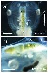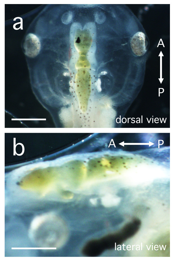 Figure 5. Injection of oil into the Xenopus larval ventricles to estimate their volumes. A living stage 46 larva after injecting 87 nL of sesame oil into the brain ventricles. The yellow sesame oil fully fills the cerebral ventricle of the larva, as observed by the morphology of the ventricles (a, dorsal view; b, lateral view). Scale bars, 0.5 mm.