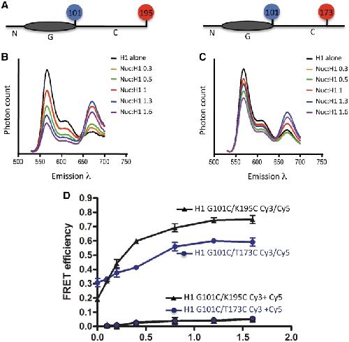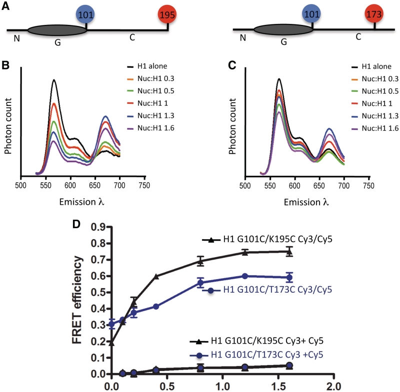 Figure 1. The H1 CTD is intrinsically disordered and condenses upon binding to nucleosomes. (A) Schematics of H1 G0101C/K195C (left) and H1 G101C/T173C (right) modified with Cy3 and Cy5 (red and blue). N, G and C denote the N-terminal, globular and C-terminal domains, respectively. (B) Binding of Cy3/Cy5-labeled H1 G101C/K195C to nucleosomes results in significant FRET. Emission spectra of 5 nM free H1 (black line) and H1 in the presence of increasing amounts of 207 N nucleosomes, as indicated. Numbers indicate molar ratio of nucleosome:H1. Excitation was at 515 nm. (C) As in (B) except protein was Cy3/Cy5-labeled H1 G101C/T173C. (D) Plot of FRET efficiency as function of nucleosome:H1 ratio for Cy3/Cy5-labeled H1 G101C/K195C and H1 G101C/T173C (filled black triangles and blue circles, respectively, Cy3/Cy5). Also shown are efficiencies for 1:1 mixtures of Cy3- and Cy5-only labeled G101C/K195C and G101C/T173C (triangles and circles, respectively, Cy3+Cy5).