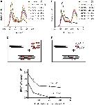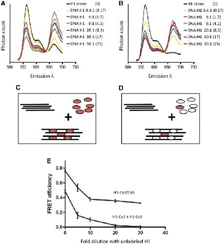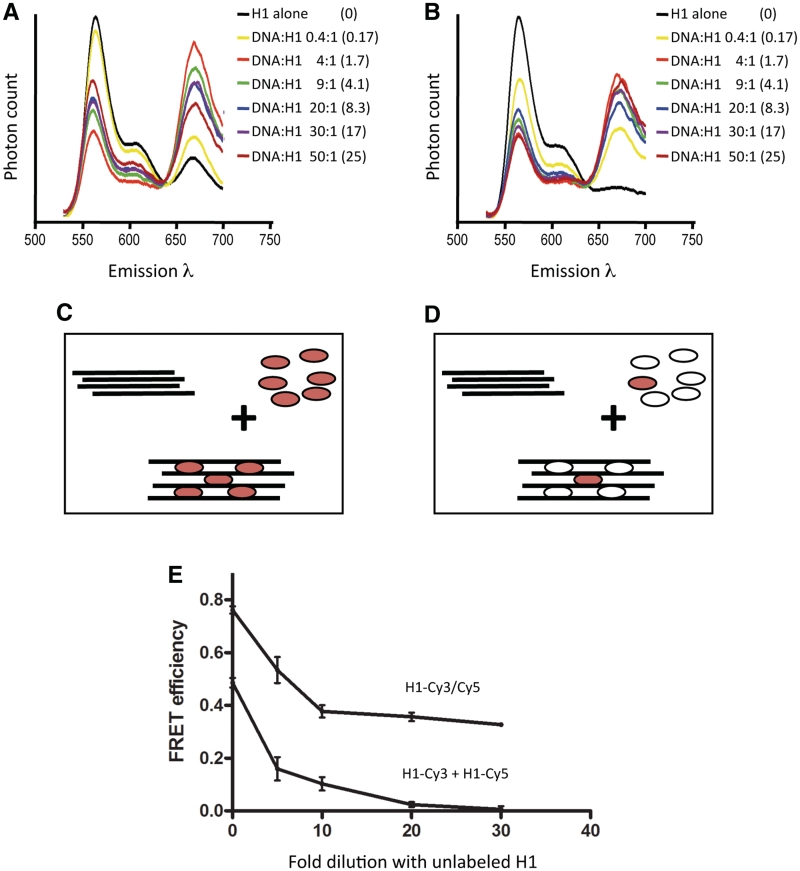 Figure 2. Binding of Cy3/Cy5-labeled H1 G101C/K195C to naked DNA results in both intra- and inter-molecular FRET. (A) Binding of Cy3/Cy5 labeled H1 G101C/K195C to naked DNA induces FRET. The protein was incubated alone (black trace) or with increasing amounts of naked 207-bp DNA fragments, as indicated. The molar ratio of DNA:H1 is indicated as is the concentration of DNA in microgram and microliter (in parenthesis). (B) Intermolecular FRET upon H1 binding to naked DNA. A 1:1 mixture of Cy3-only and Cy5-only labeled H1 G101C/K195C was incubated alone or in the presence of increasing amounts of 207-bp DNA fragment as in A. (C) Schematic of H1–DNA ‘tramtrack’ structure (24). H1 is indicated by the red ovals; DNA by the lines. (D) Model for dilution of inter-molecular FRET with unlabeled H1 (open ovals). (E) Elimination of inter-molecular FRET to reveal intra-molecular FRET. Efficiencies for samples prepared as in A (H1-Cy3/Cy5) or B (H1-Cy3 + H1-Cy5) and were determined and plotted (0 point) along with efficiencies for samples in which increasing fractions of the H1 was not labeled with fluorophores.