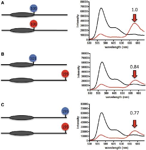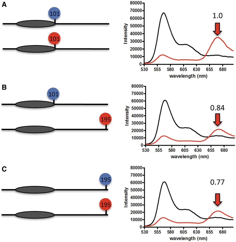 Figure 3. Intermolecular FRET between combinations of labeled sites in H1 upon binding to naked DNA. Pairs of the single substitution mutants H1 G101C and H1 K195C labeled with either Cy3 or Cy5 were mixed in a 1:1 ratio and emission spectra recorded before (black trace) or after (red trace) addition of 207 bp naked DNA fragments. Emission was at 515 nM. (A) H1 G101C-Cy3 + H1 G101C-Cy5. (B) H1 G101C-Cy3 + H1 K195C-Cy5. (C) H1 K195C-Cy3 + H1 K195C-Cy5. The red arrow indicates the Cy5 emission peak. Numbers above the arrow indicate relative FRET efficiency in each experiment.