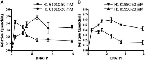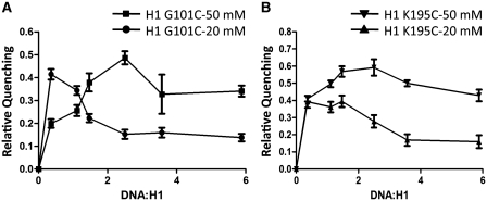 Figure 5. Quenching due to H1 binding naked DNA. (A) Quenching of Cy5-H1 G101C fluorescence depends on binding mode. The protein was incubated with increasing amounts of 207 bp naked DNA fragment and the fraction of Cy5 fluorescence quenched determined as compared to fluorescence in the absence of DNA and plotted. Quenching in buffers containing 50 or 20 mM NaCl (cooperative and non-cooperative conditions, respectively) is shown. (B) As in A except Cy5-H1 K195C was used.