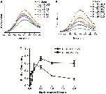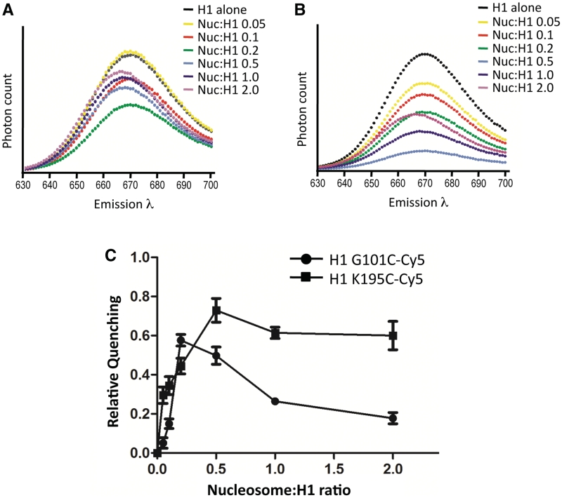 Figure 4. Nucleosome-induced fluorophore quenching is dependent on attachment site. (A) Emission spectra of Cy5-modified H1 G101C were recorded in the absence and presence of increasing concentrations of nucleosomes, as indicated. (B) As in A except Cy5-H1 K195C was used. (C) Plots of the extent of quenching as a function of the nucleosome:H1 ratio. Quenching was determined by the peak height compared to that in the absence of nucleosomes (see ‘Materials and Methods’ section).